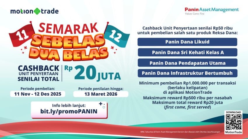 MNC Sekuritas bersama Panin Asset Management berkolaborasi Untuk promo “Semarak 11.12” Di Langkah online trading MotionTrade. Total bonus cashback Untuk promo ini hingga Rp20.000.000 (dua puluh juta Nilai Mata Uang Nasional). Adapun syarat Untuk mengikuti promo ini sangat mudah. Investor wajib melakukan salah satu pembelian produk reksa dana Panin Asset Management senilai minimum Rp1.000.000,- (satu juta Nilai Mata Uang Nasional) Di Langkah MotionTrade. Produk Panin Asset Management yang diikutsertakan Untuk promo ini adalah: